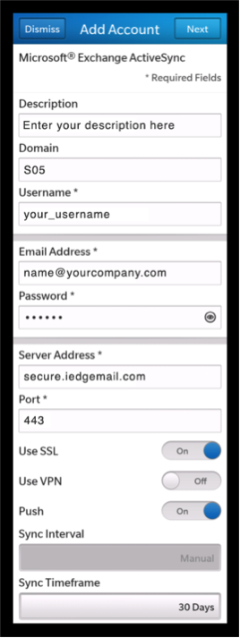 5. Enter a Description of your account (for your own reference). The Domain is S05, and the Username, Email Address & Password can be found in the account information you receive from us. The Server Address is secure.iedgemail.com. Leave the other fields as default. Once done, click on Next.